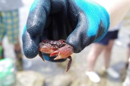暗褐色の甲に斑模様のある、幅5~6㎝のカニを手に取り、奥野先生が歓声をあげました。