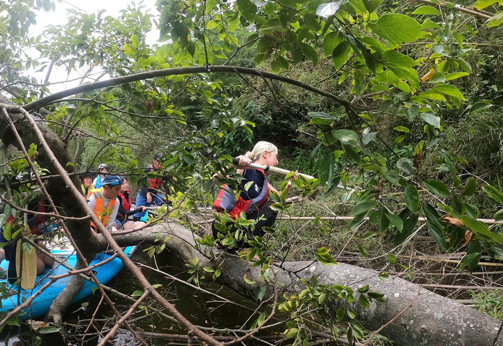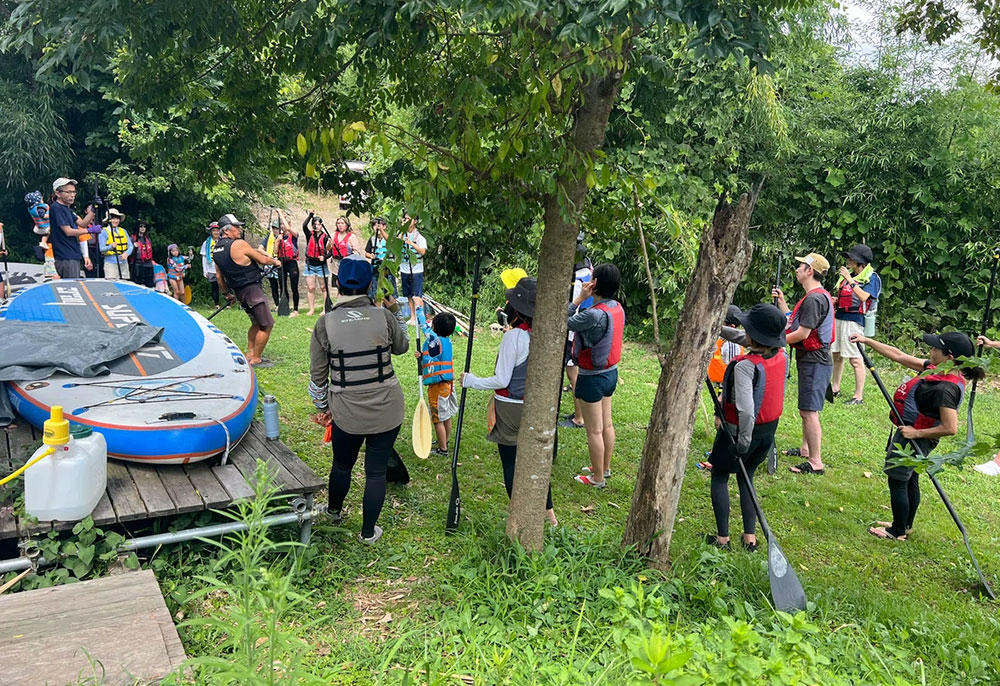 早速チームに分かれてSUPに乗り込みます。海辺や街でのごみ拾い活動とは少し違い、同じSUPに乗る仲間たちとの一体感が生まれやすいのがSUPでのごみ拾いの特徴です。力をあわせて漕ぎ、仲間がごみをとりやすいようにSUPの舵をとります。