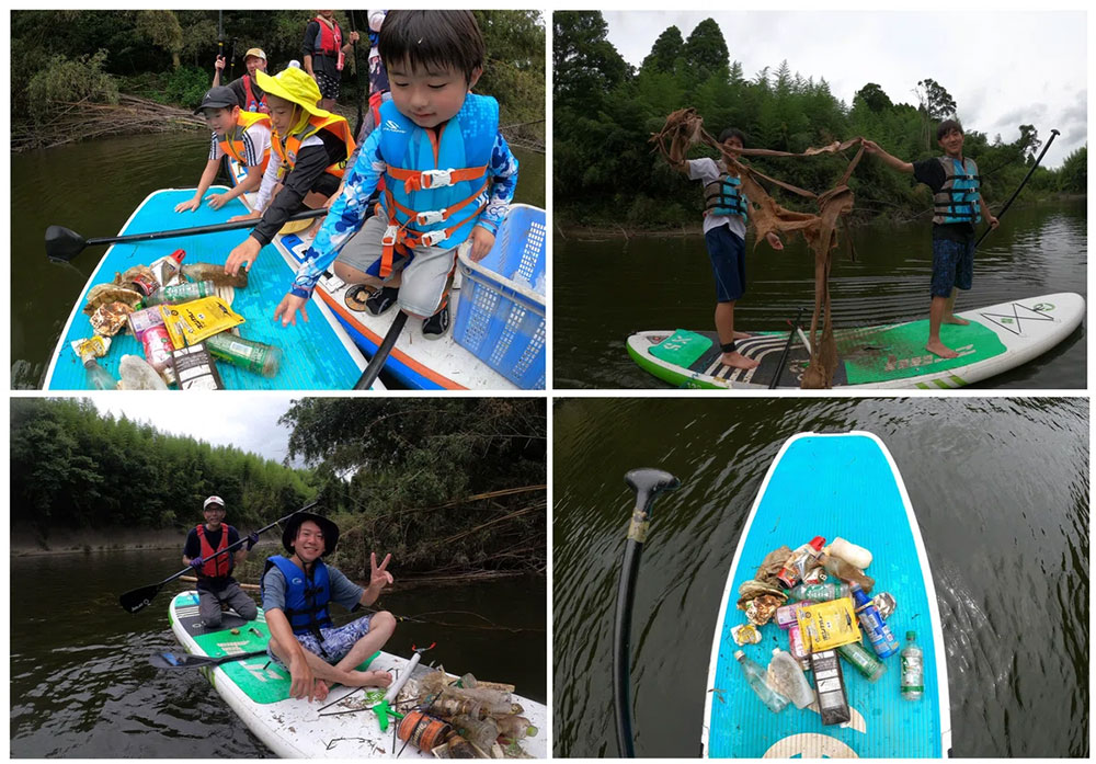 いすみパドルクラブでは、SUP(スタンドアップパドルボード)を活用した河川清掃活動を月に1回、定期的に行っています。ボードに乗って川面からゆっくりと進み、漂着したペットボトルや発泡スチロール、流木に絡まったごみなどを回収します。水上からしか見えない場所にもアプローチできるのがSUP清掃の強みです。