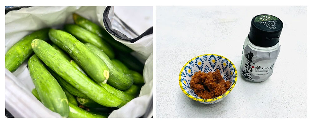2時間ほどのSUPごみ拾いを終え、参加者の皆さんは少しおつかれの様子。そんな参加者のみなさんのために、と今回は特別にご近所の農家さんお手製の無農薬きゅうりが登場。味噌と勝浦でつくられているという美味しい塩をつけて食べ、元気をチャージしつつ、うみごmeのワークを行いました。
