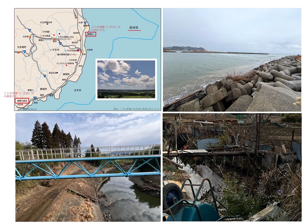 左上:いすみライフスタイル研究所の資料より夷隅川の地図、右上:夷隅川の河口、左下:中流域の様子。右岸にごみがたまっている、右下:上流部付近。田んぼの間を幅が狭くなった川が通る