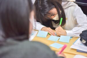 最初のワークでは、生徒のみなさんと一緒に「自分にとってごみとは何か」について考えました。 付箋に思いついた言葉や考えを書き出し、グループで共有する中で、「ごみってなんだろう?」という問いにさまざまな角度から向き合うことができました。
