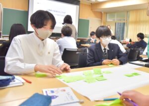 最初のワークでは、生徒のみなさんと一緒に「自分にとってごみとは何か」について考えました。 付箋に思いついた言葉や考えを書き出し、グループで共有する中で、「ごみってなんだろう?」という問いにさまざまな角度から向き合うことができました。