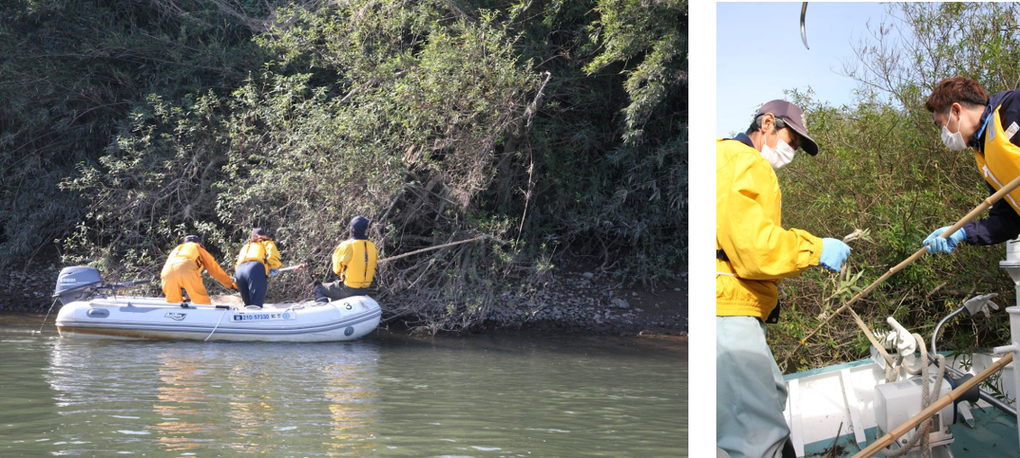 実際に北上川下流域の様子を見てみよう!~舟やボートに乗っての川岸の清掃活動