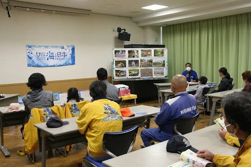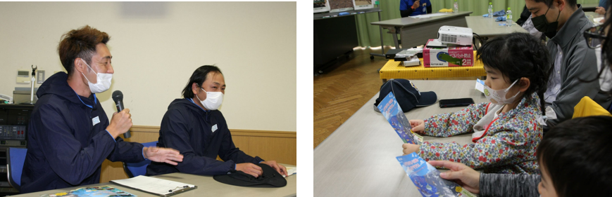 北上川での清掃活動を終えた参加者は、回収したごみを集約した後、防災センターの研修室に移動し、一緒に清掃を行った「いわて海ごみなくし隊」隊長の岩手県住みます芸人アンダーエイジの進行で、出前授業に臨みました。講師を務めたのはNPO法人北上川サポート協会の金野和則事務局長。岩手県が「いわて海ごみなくし隊」と共同で制作した小学生向けの海洋ごみ対策啓発パンフレットを教材にしながら「海のごみの約8割は陸・街から流れ込んでいる」ことを説明し。さらに、北上川などの河川でさまざまなものが不法投棄されている現状について写真を見せながら説明しました。