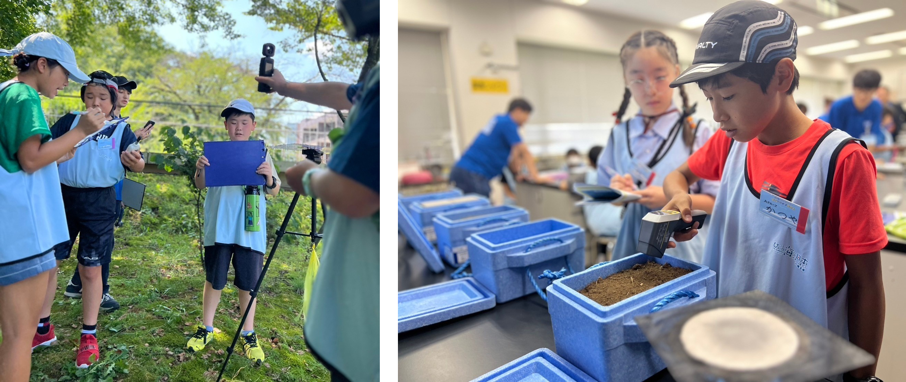 海風をより詳しく知るために行われた実験では、屋外で太陽に当てておいた土や砂、水、コンクリートなどを用意。子供たちは放射温度計でそれぞれの表面温度を測りながら、土などの物質は温まりやすく冷めやすいこと、水は温まりにくく、冷めにくいことを学びます。物質ごとで全く違う結果となったことに子供たちは驚いている様子でした。