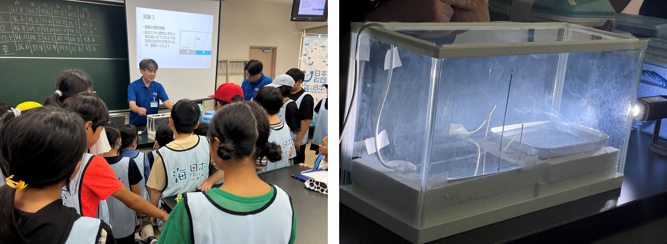 その後は、海風の原理を視覚的に学ぶために、水槽の中に陸地と海の部分を作り、陸地をヒーターで温めることで、温度が低い海から風が吹く様子を観察しました。