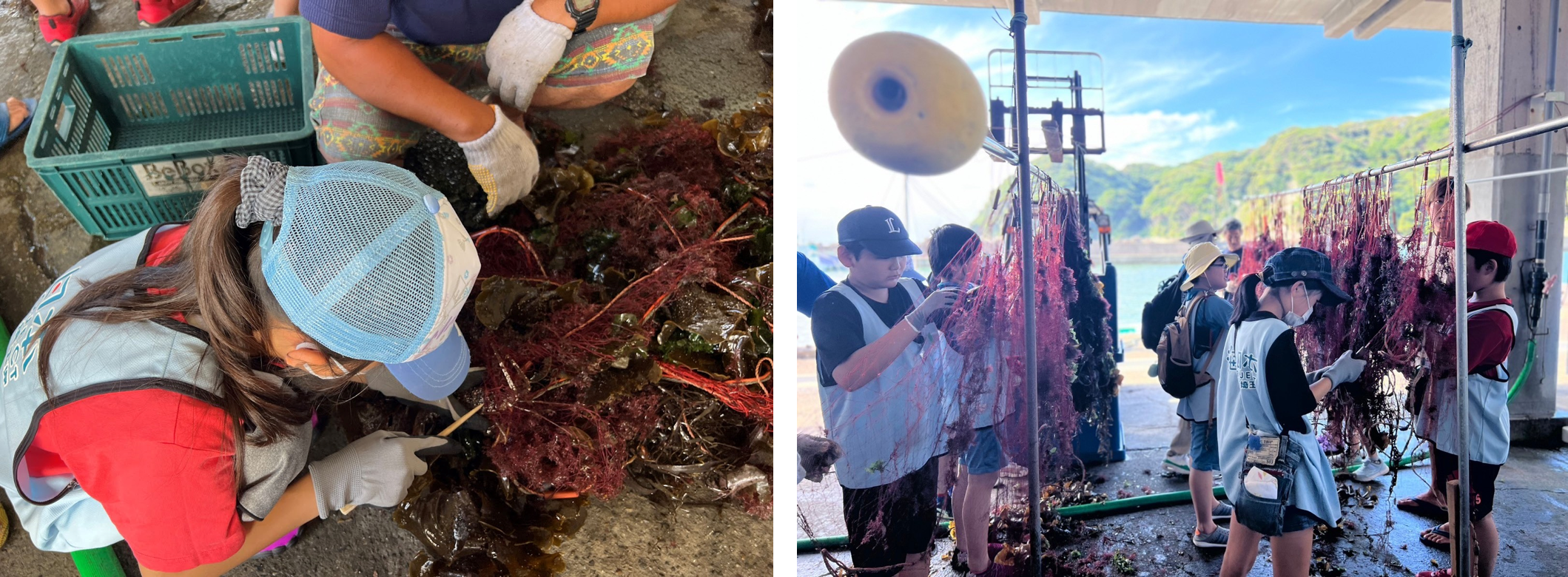 2日目は早朝から勝浦市の浜行川漁港での伊勢海老漁を体験。5つの班に分かれた子供たちは、10人以上の地元漁師さん達から丁寧に教えてもらいながら、網にかかった伊勢海老や魚、海藻、ごみなどを取り外しました。最初は上手に外せなかった子供たちも、悪戦苦闘しながらも徐々に慣れていき、最後には漁師さんから褒められるくらいに上達しました。