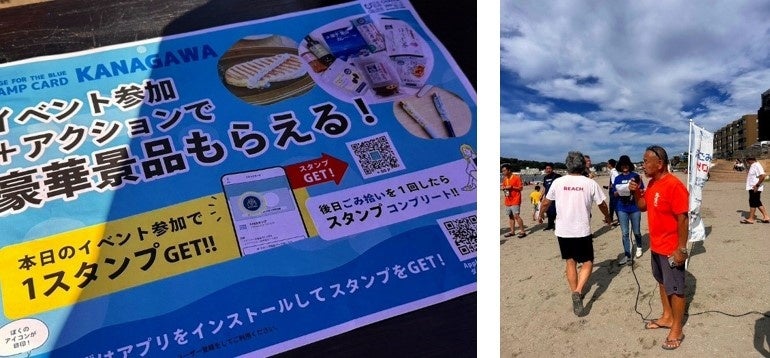 逗子海岸東浜での「スズキヤ×湘南ビーチFM 合同ビーチクリーン&ビーサン飛ばし大会」にはまずごみ拾いアプリ「ユイマール」をダウンロード、そして大会参加の印となるスタンプをゲットしてから参加していただきました。競技中の実況アナウンスはもちろん、司会者と運営スタッフが海洋ごみがどこから来るかなど海洋ごみ問題の現状をアナウンス、海洋ごみの現状を参加者に周知しました。