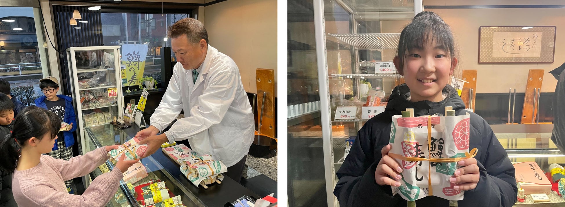 一般社団法人とやまミライラボは、2023年8月に実施した学習体験イベント「富山ますずし学校」で子どもたちが制作したオリジナルパッケージの手渡し式を、2023年11月28日(火)に開催いたしました。「富山ますずし学校」に参加した富山県内の小学5・6年生のうち9名が、販売店の一つである「富山名産鱒の寿し 高芳」(以下、「高芳」)を訪れ、同月30日(木)から販売開始するパッケージを贈呈しました。