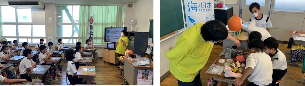 子どもたちに、「海洋ごみ」をより身近な問題として自分事に感じてもらい、自分たちにできることが何かを考えてもらうため、オリジナルの教材(動画・パンフレット)を使用し、県内の小学校8校、10クラスで出前授業を実施しました。