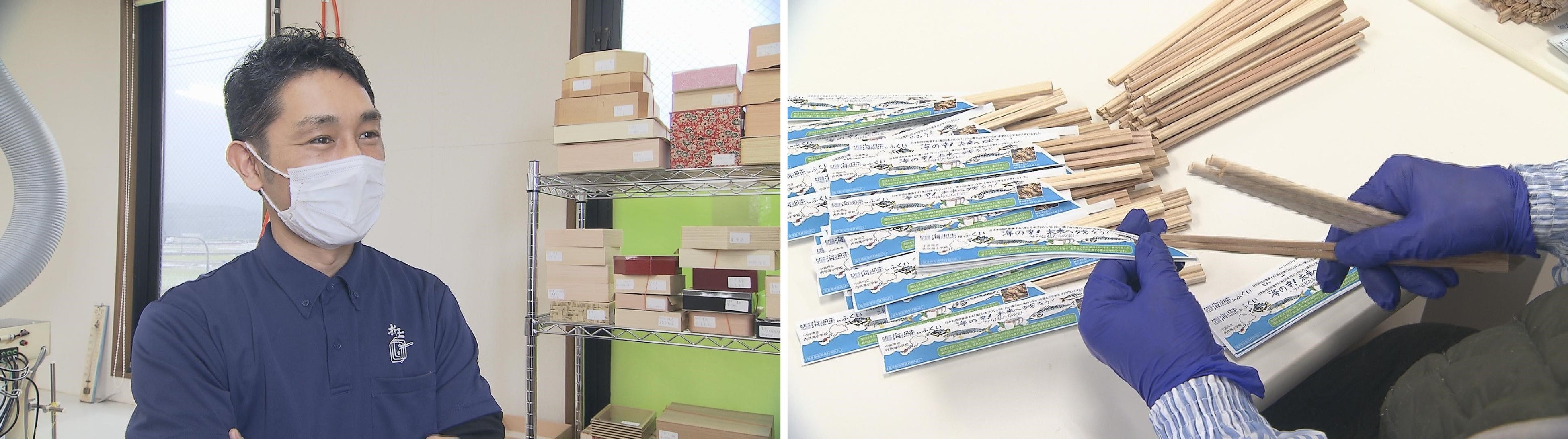 ※価格:箸袋750円(500枚)、県産材割り箸480円(100膳) 税別