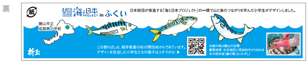 2022年夏、小浜市と勝山市で海の恵みや海洋ごみについての体験授業を実施。山を豊かにすることが海を豊かにしてくれるという“つながり”について学びました。学習の成果はオンライン合同発表会にて発表。勝山と小浜、お互いに鯖の名物があることによってさらに意気投合し、記念に鯖をデザインした箸袋を制作することになりました。