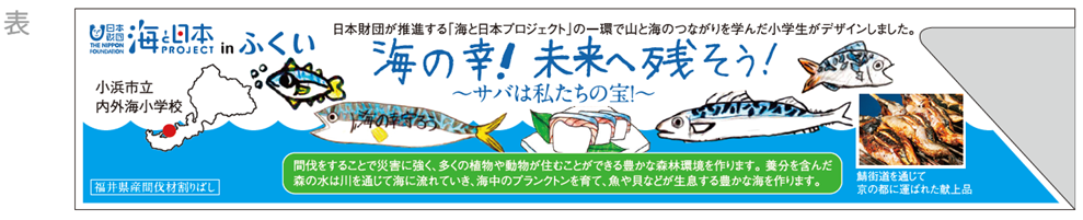 箸袋には、山と海の“つながり”について学んだ児童のイラストやメッセージが盛り込まれています。大きなメッセージとして、鯖を通して海洋資源の保全を訴えています。