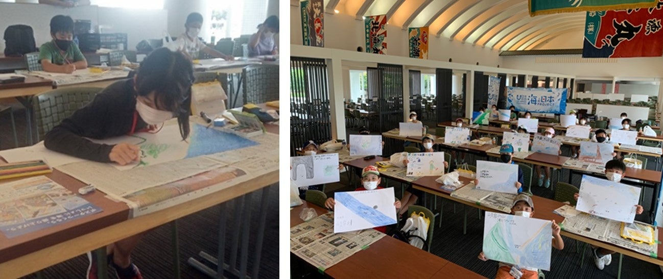 子どもたちは2日間で学んだことを表現するポスターを製作。海洋連盟のコンテスト「うみぽす」と連携して「海とつながる岐阜」をテーマに、食べて、聞いて、体験したことを絵にしました。豊かな海のために岐阜の山や川が大切な役割を担っていること、海のためにごみを捨てないこと、山・川・海はつながっていることなどをポスターを描きました。ポスター作品は9月1日から1か月間、岐阜県内を走る「長良川鉄道」の車内で展示する予定です。
