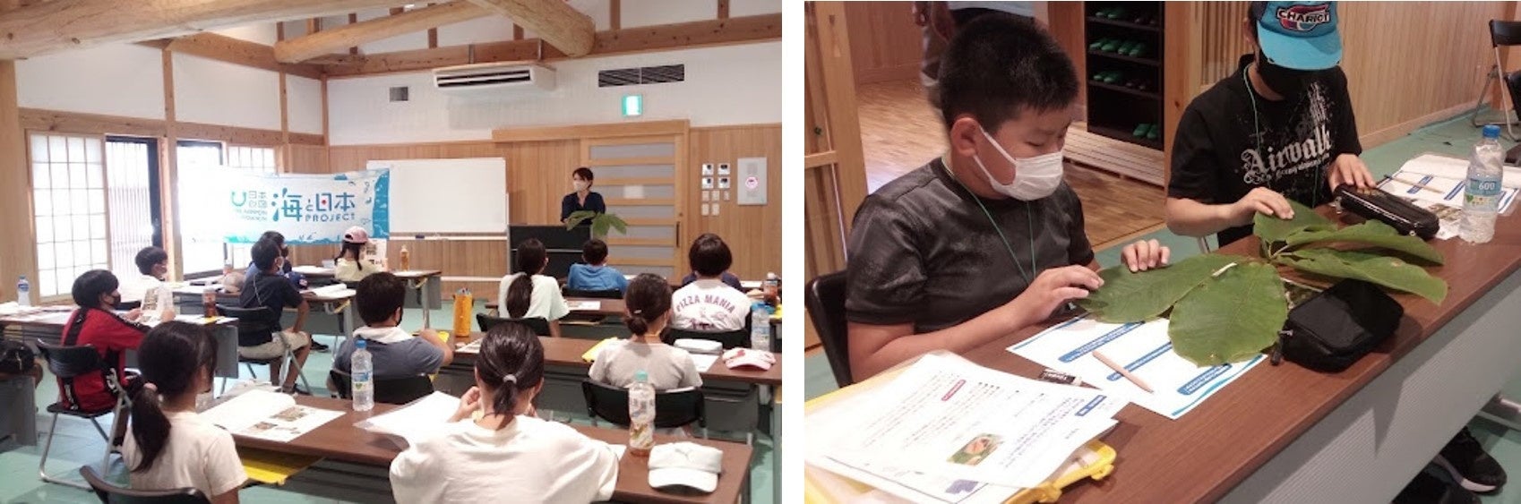 氷見市海浜植物園の園長・井出哲哉さんの講義では、富山の海の豊かさは岐阜の山で育まれた栄養分たっぷりの水が川をつたって流れ着いているおかげで”森は海の恋人”であるという話を聞きました。岐阜の山が富山の海に役立っている話を聞いた子どもたちからは「うれしい」「山や川を大切にしたい」といった声が聞こえました。また海洋プラスチックごみについての話を聞き、ウミガメなどの生き物がエサと間違えてビニールなどを食べてしまったりする事実を知ると「ごみを減らしたい」などの意見が出ました。