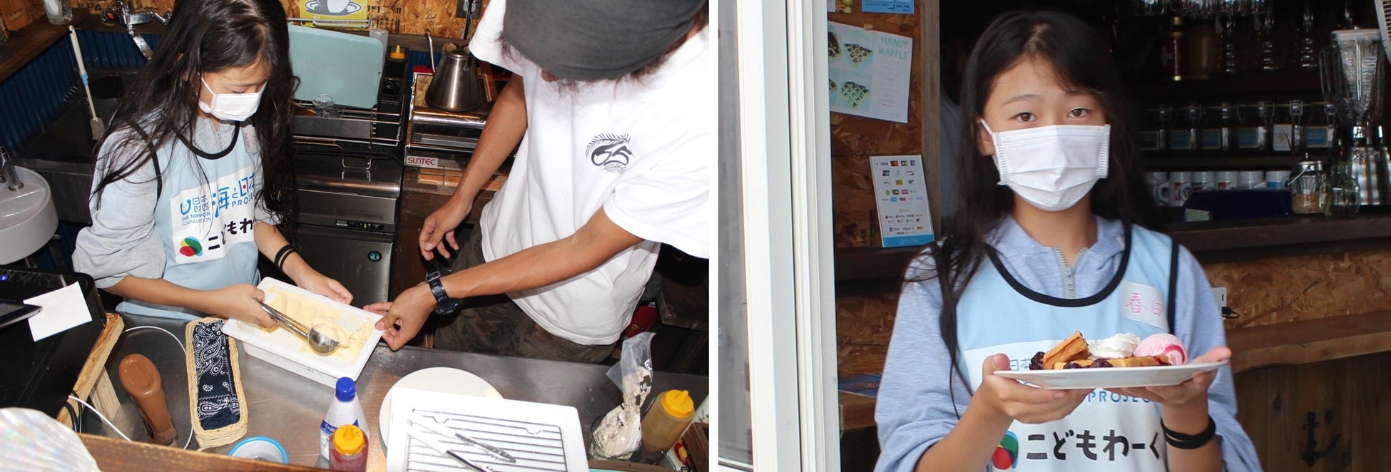 海岸沿いのダイビング店では、海を見ながらのカフェも魅力の一つです。今回は保護者がお客さん役になり、参加者がドリンクやワッフルを作って提供しました。子供たちからは「カフェ体験で自分が作れて楽しかった」などの声が聞かれました。
