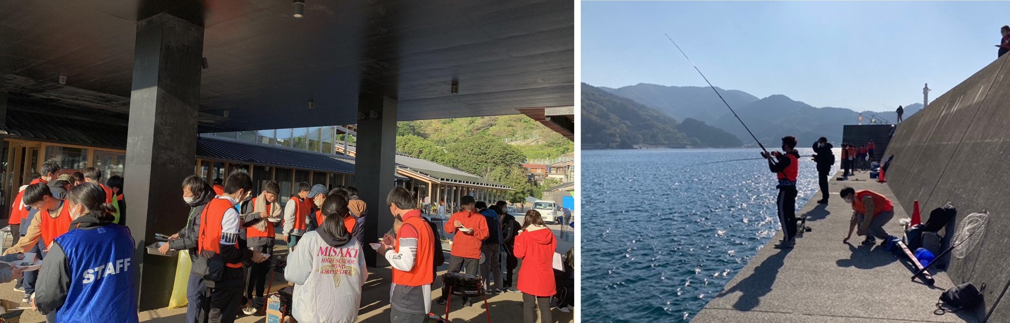 続いて、お待ちかねの「釣り大会」!公平にくじで決めた場所で3時間真剣に釣りました。釣れた時には他のチームからも大きな歓声があがっていました。釣りの得点は、①魚の長さ、②魚の重さ、③魚の市場価値の3つのポイントで競いました。魚の計量は、三崎高校のボランティアの生徒が行いました。