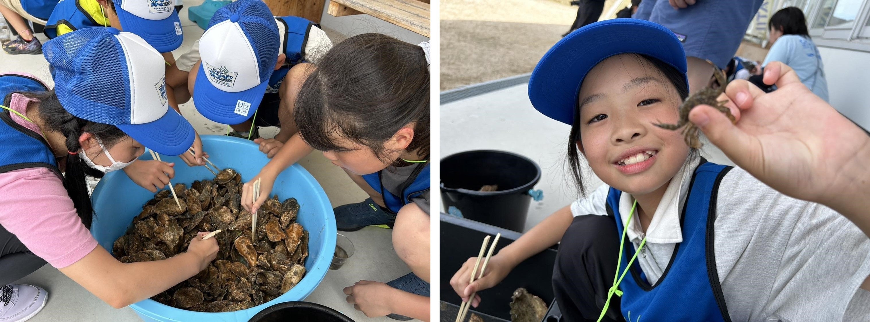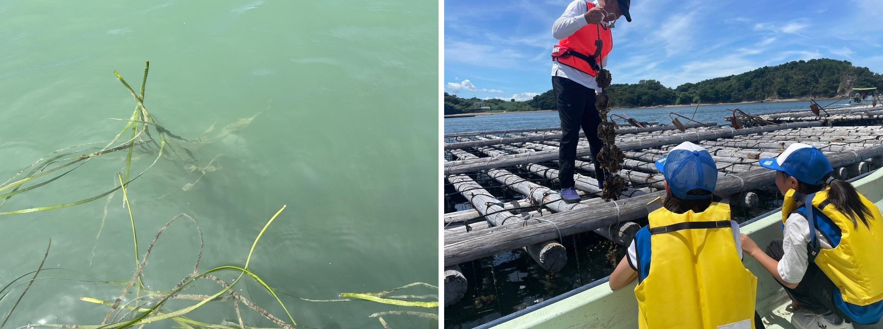 前日に宇和海をフィールドに学習した参加者がこの日向かうのは瀬戸内海。松山市からバスに乗り、3時間以上の大移動を経てたどり着いたのは”アマモの聖地”である岡山県備前市日生(ひなせ)町です。日生町では、地元の漁協や環境保全団体が一体となり、約40年に渡りアマモの保全活動を続けています。この日の学習拠点である渚の交番 ひなせうみラボに到着した一行は、早速この日最初の学習プログラムであるアマモ場調査に出かけます。日生漁協の組合員さんが操船する船に乗り込み、参加者が向かうのは沖合に位置する大多府島の沿岸に生育するアマモ場です。夏場の高水温が影響し、この時期まで残っているアマモ場は少ないそうですが船の上から実際に生えているアマモを見つけ、長さや太さ、付着している生物を観察しました。移動の道中では、日生漁協が取り組む牡蠣養殖のいかだにも立ち寄り、アマモ場は水質の安定をもたらすことで牡蠣養殖を支えていることを学びました。