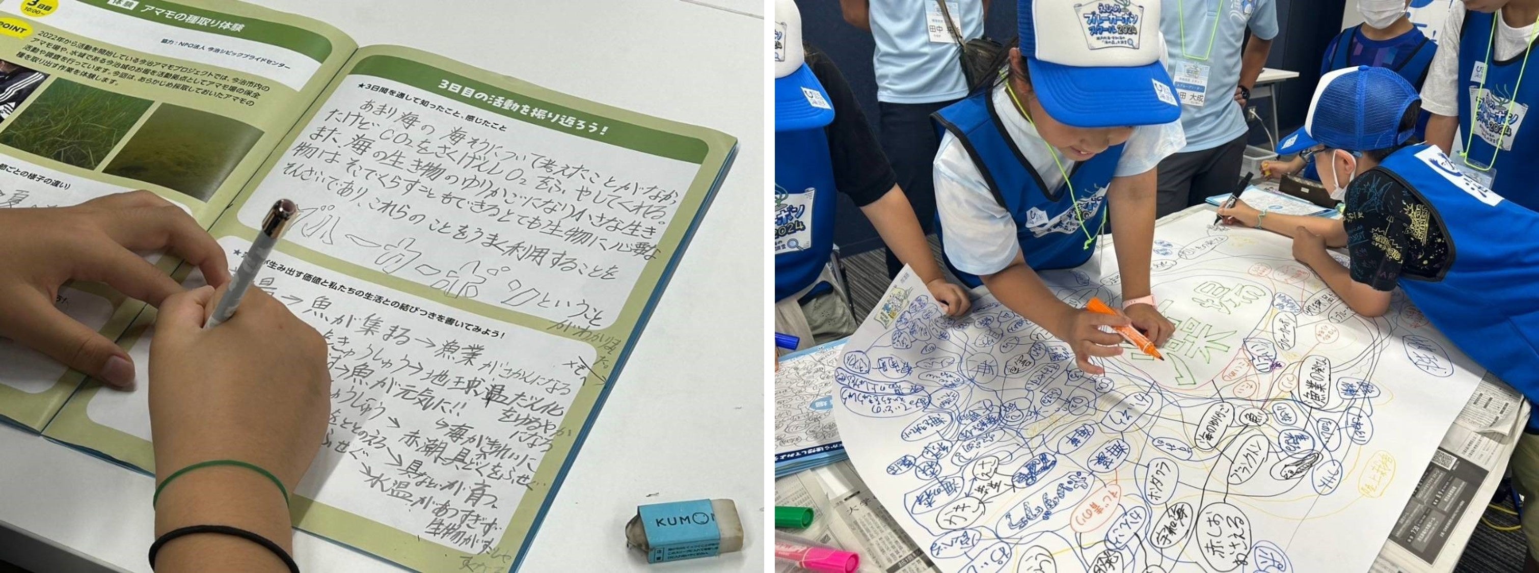 最後の学習プログラムとして実施したのは、3日間のまとめ学習です。今回のイベントのゴールは、藻場の役割と私たちとの繋がりを明らかにすること。まずは、1日目の最初に行った藻場を中心とした「マインドマップ」作りを再度各自で行いました。イベントが始まる前と比較すると、書き込むキーワードや繋がりを示す線の量が大幅に増え、参加者一人ひとりの学習の成果が垣間見えました。