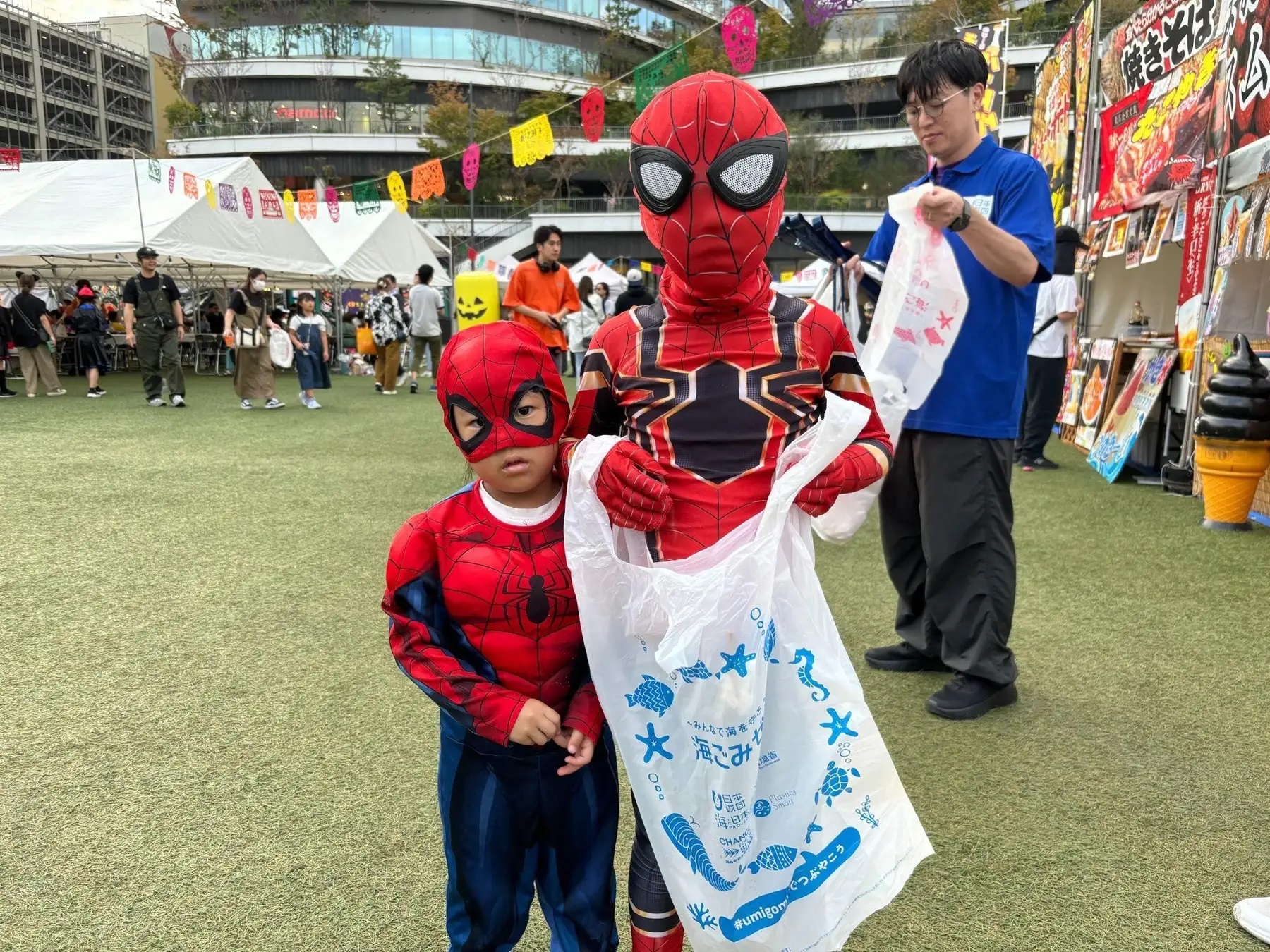 ハロウィン会場ではごみを分別するブースを設け、イベントで出たごみをどう分けるのか、考える機会を創出しました。また会場内ではスタッフが適宜、参加者や来場者にごみ袋を配布して会場周りのごみ拾いを呼び掛けました。ごみは拾う、分別する、ポイ捨てはしないという意識は当たり前のことですが、このイベントを通して、もう一度自分の行動を見つめ直すきっかけになってもらえればと思います。