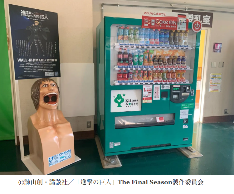 一般社団法人うみらいふは、城島高原パークおよびコカ・コーラ ボトラーズジャパン株式会社と連携し、TVアニメ『進撃の巨人』に登場する巨人を模った空容器回収リサイクルボックスを 2023年11月29日朝10時頃、城島高原パーク内の休憩室に設置いたしました。