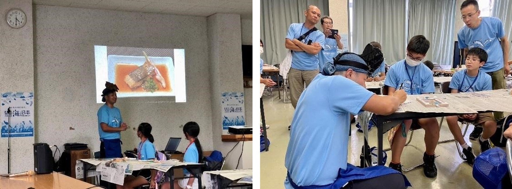 本来タイ・カンパチの養殖場を見学するスケジュールでしたが、台風6号の影響で海が時化て船を出すことが出来ず、離島センターで村瀬先生による魚の授業が行われました。村瀬先生は、延岡市の土々呂にある宮崎大学の延岡フィールドで勤務されており、宮崎県の魚類の多様性に関する研究をしながら、宮崎の魚図鑑や、学習用カルタを制作しています。そのカルタを使って、日向灘に生息する魚を「暖かい海に住む魚」、「冷たい海に住む魚」、「中間の海に住む魚」で分類するゲームをしました。わからないことは、村瀬先生やさかな芸人ハットリさんに質問し、それぞれが予想した後、図鑑を使って正しい生息エリアを導き出しました。黒潮と親潮の栄養を含んだ海が混ざり、多様な魚が生息することを知ることができ、子供たちはそれぞれ文章や絵で考えをまとめ、学習ノートに記入していました。
