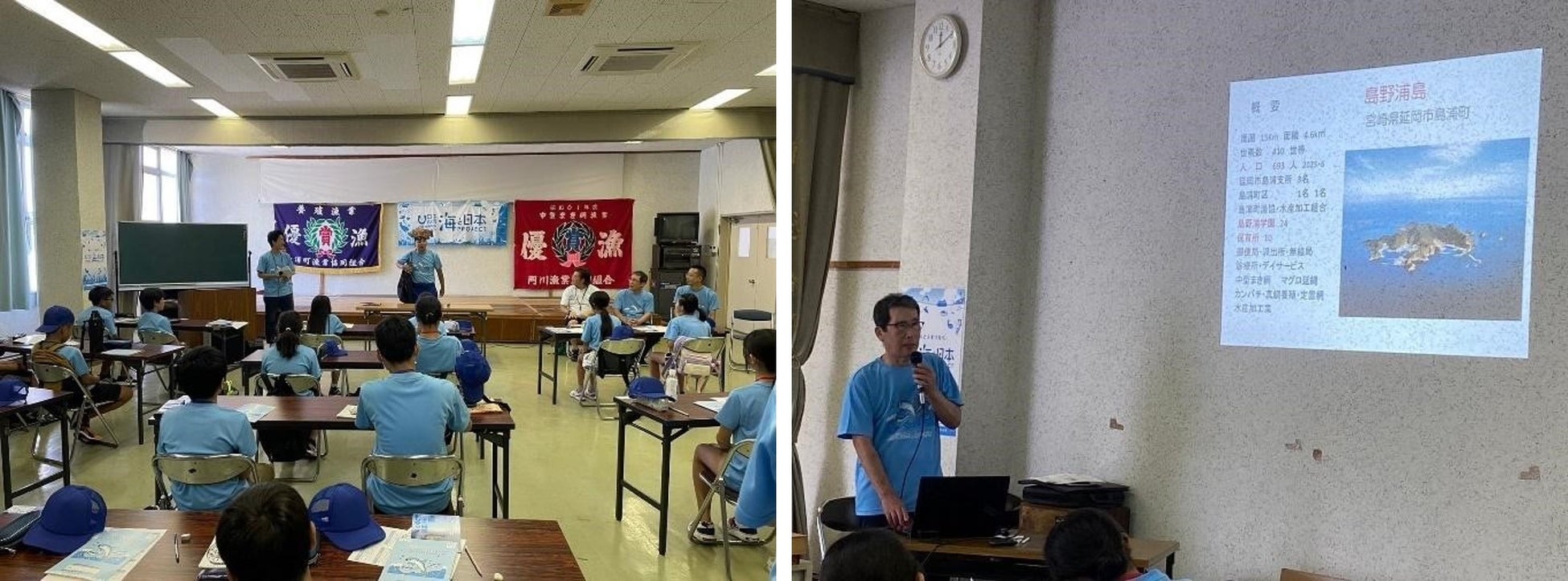 延岡市の阿蘇港からチャーター船で10分ほど行くと、2日間の拠点となる島野浦離島センターに到着しました。オブザーバーとして見守ってくださる宮崎大学農学部海洋生物環境学科准教授の村瀬敦宣先生からの挨拶で始まり、プロジェクトサポーターのさかな芸人ハットリさんが登場し、子供たちの緊張をほぐしてくださいました。