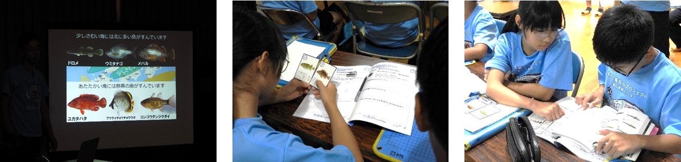 2日目が始まりました。最初の活動は、村瀬先生による魚の授業です。村瀬先生は宮崎県の魚類の多様性に関する研究を行い、宮崎の魚図鑑を制作しています。また、宮崎近海の魚をカルタにした「お魚カルタ」を学生らと制作しています。この日はそのカルタを使って、日向灘に生息する魚を「暖かい海に住む魚」、「冷たい海に住む魚」、「中間の海に住む魚」に分類するゲームを行いました。児童たちはお魚図鑑を使って真剣に調べながらゲームに取り組みました。ゲームが終わるころには、黒潮と親潮の栄養を含んだ海が混ざり合うことで多様な魚が生息することを知り、宮崎の海についての理解を深めました。