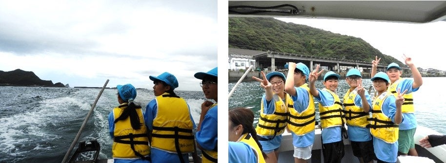 サポーターから「島野浦島は、延岡の沖合に浮かぶ宮崎県最大の離島で、ここにはおよそ680人が暮らし、島の8割以上が山林に覆われており、海だけではなく山の豊かさも感じる島」と説明を受け、児童らは上陸する前に、自然の恵みが豊富な中で人々が生活しているということを学びました。上南方小学校の児童が通う地域は海岸から約13km内陸に位置した山に囲まれた場所にあるため、初めて船に乗る児童がほとんど。海上からの景色を目に焼き付け、島野浦島に上陸しました。