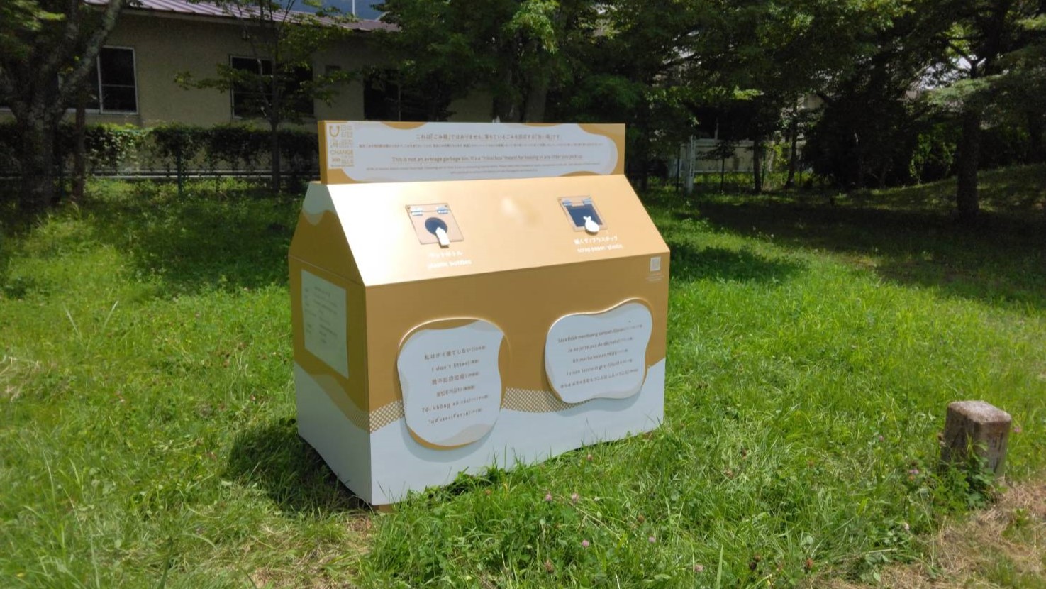 今回拾い箱を設置した富士五湖は、国内屈指の観光地であり、特にここ数年、インバウンド客の急激な増加により観光公害も多く発生しています。8月のハイシーズンを迎え、更なる観光客の増加も見込まれる中、拾い箱には、「私はポイ捨てしない!」というメッセージを10か国語と甲州弁で表記しました。またQRコードをかざすと啓発メッセージが富士五湖の映像とともに流れます。