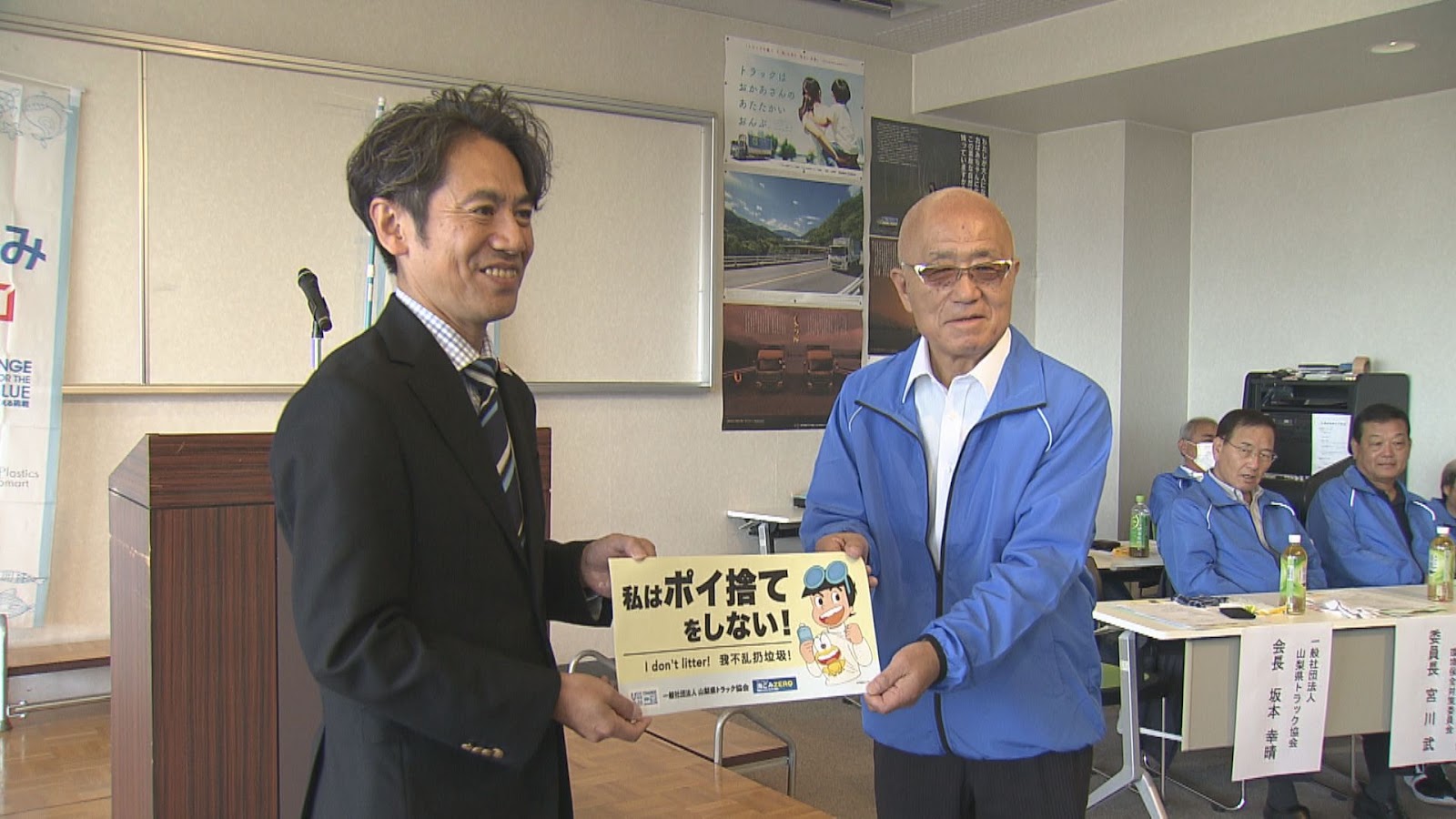 山梨のトラックドライバーがごみ削減をアピール! 「ポイ捨て禁止ステッカーの贈呈式」を開催しました!