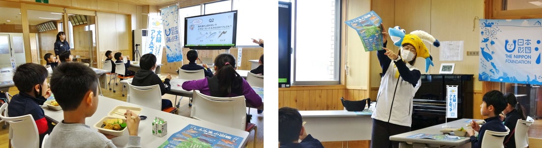 学校給食がない大間町では、食育の機会が乏しく、子どもたちの魚離れ、海離れが進んでいることが課題になっています。そこで、昼食時間に実行委員会公式キャラクターの”アゲごんべ”姿で学校へ訪問し、魚が苦手な子どもでも食べやすいお弁当「海のアゲ弁(大間アゲ魚っ子弁当)」を全校児童・教職員のみなさんへ提供。オリジナル動画を視聴してもらいながら、大間の海や漁業の特徴、海の問題を、楽しく食べて学びました。