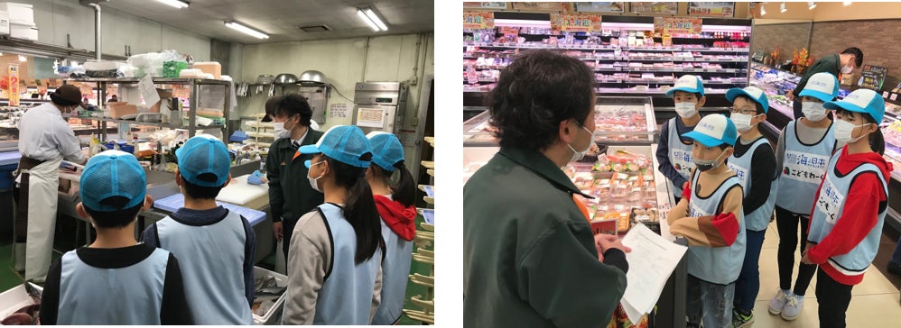 まずは清水さんから「産地直送」をキーワードにお魚の仕入れ方法を教えてもらいます。新鮮なお魚を漁場から直接購入して、水揚げの翌日には店舗で販売される仕組みに子供たちは驚きを隠せません。