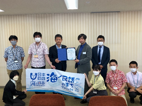 日本中に残された海にまつわる民話を発掘し、その民話のストーリーと、そこに込められた「想い」「警鐘」「教訓」を、親しみやすいアニメーションとして映像化します。当日は、チーフアニメプロデューサーをはじめとする事務局メンバーが「海ノ民話のまち」として認定した15のエリアのうちの1つである愛知県蒲郡市の鈴木寿明市長を表敬訪問し、「海ノ民話のまち」認定証贈呈式を行いました。