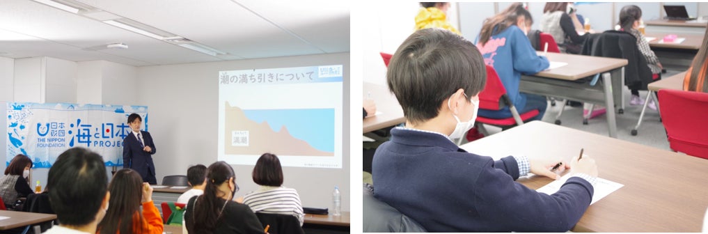 アニメーション鑑賞後、民話に込められた海の学びを詳しく扱っていきます。民話の舞台は、四国と本州をつなぐ瀬戸内しまなみ海道沿いに浮かぶ小さな鯛崎島。隣の能島とともに島そのものが村上海賊の城で、潮の満ち引きの差が激しく荒波に守られた海の要塞でした。泳ぎが得意な海の生物たちですら浜に打ち上げられてしまうほど、海の備えが必要な地域です。授業では、潮の満ち引きはなぜ発生するのか、図や映像、全国各地の潮位を予測する気象庁のHPを用いて、都内と今治を比較しながらその特徴について学びました。海の備えが必要で危険な反面、引き潮時は珍しい海洋生物と出会えることなど海の魅力にも触れ、海とうまく共生していくことの大切さを知ることに繋がりました。