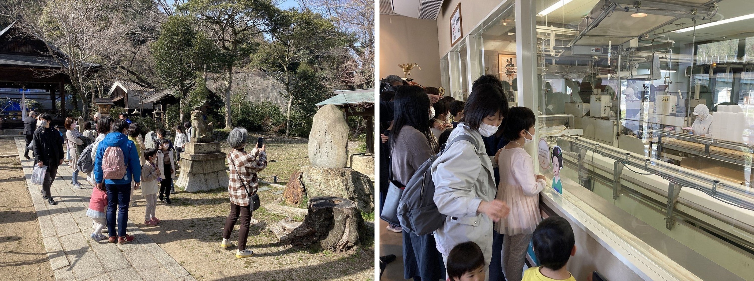 小学校低学年を中心とした7家族、25人が参加しました。民話アニメを視聴後、バスでアニメの舞台となった関蝉丸神社へ。「これやこの 行くも帰るも 別れては知るも知らぬも 逢坂の関」とかかれた歌碑や、関清水と呼ばれた美しい水が湧き出ていたとされる泉の後などを見学しました。また、コラボ商品も展開される予定の「井筒八つ橋本舗」のお菓子工場を見学し、地域とお菓子の関りなどを聞きました。