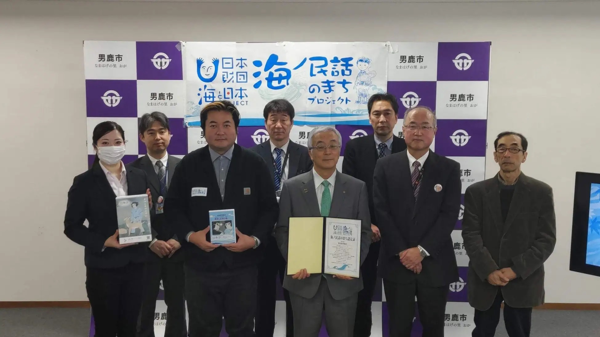 一般社団法人日本昔ばなし協会と日本財団が取り組む「海ノ民話のまちプロジェクト」は、日本中に残された海にまつわる民話を発掘し、その民話のストーリーとその民話に込められた「想い」「警鐘」「教訓」を、親しみやすいアニメーションとして映像化する事業です。この度、秋田県男鹿市を舞台にした海ノ民話アニメーション「黒神と赤神の戦い」が完成したため、12月26日(火)にアニメ監督が男鹿市役所に訪問し、アニメのお披露目と「海ノ民話のまち」認定式を実施しました。