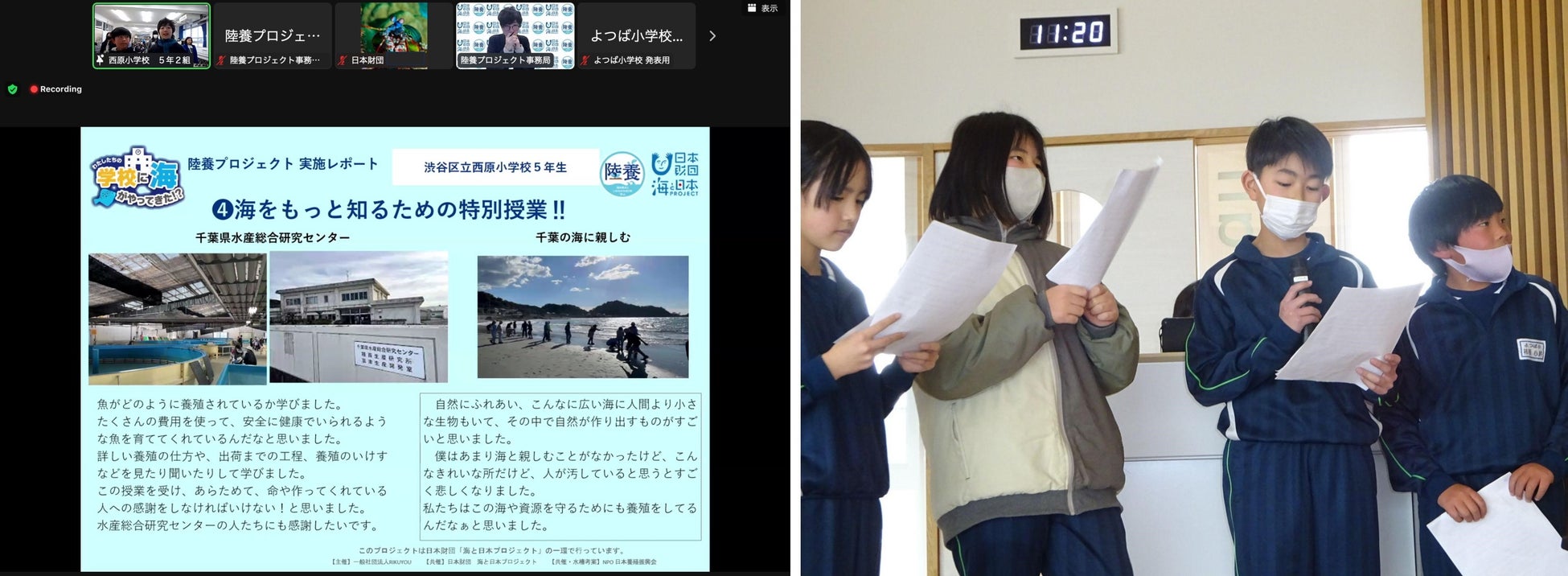 今回は、みんなで海の問題について考える「陸養プロジェクト 交流会」を2024年3月6日(水)にオンラインで開催しました。陸養プロジェクトを通して学んだ海の恵みや水産業のこと、自分たちで自主的に調べたこと等について発表、交流しました。交流会に参加したのは、東京都渋谷区立西原小学校、大阪府堺市立東百舌鳥小学校、愛知県蒲郡市塩津小学校、富山県魚津市立よつば小学校の4校です。