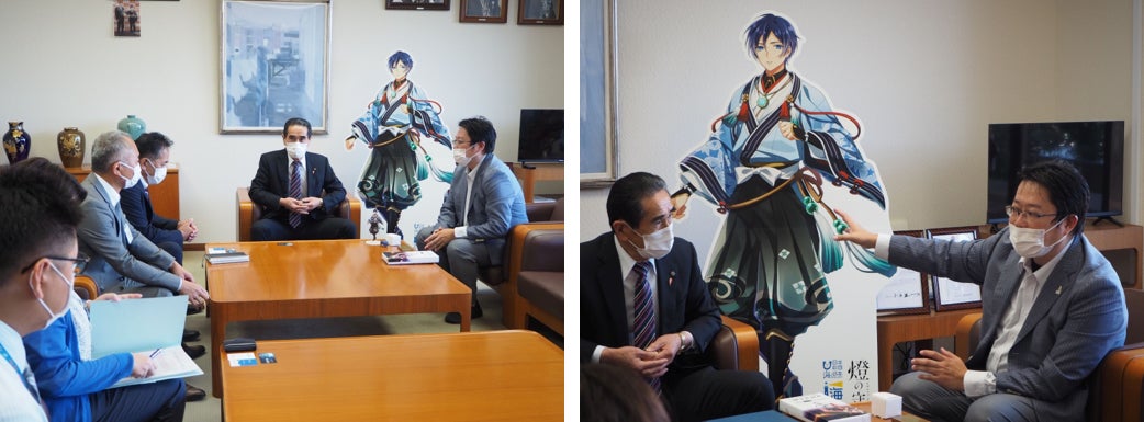 燈の守り人キャラクターを活用して、地域の灯台を歴史・文化資産として活用する機運をつくるため、キャラクター化の対象となる「御前埼灯台」が立地している静岡県御前崎市の栁澤重夫市長を、「燈の守り人」製作委員会プロデューサーの柴田英知が2022年11月4日(金)に表敬訪問し、キャラクターの贈呈式を実施しました。