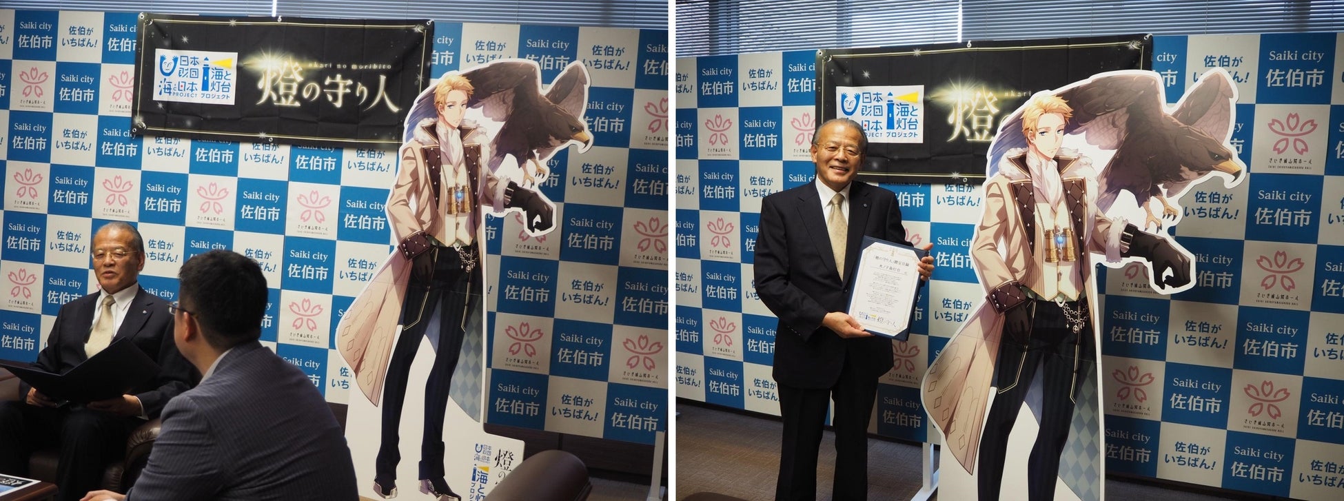 大分県佐伯市「水ノ子島灯台」を擬人化したキャラクターが完成! 「燈の守り人」製作委員会プロデューサーが 田中利明市長を表敬訪問しキャラクター贈呈式を実施しました