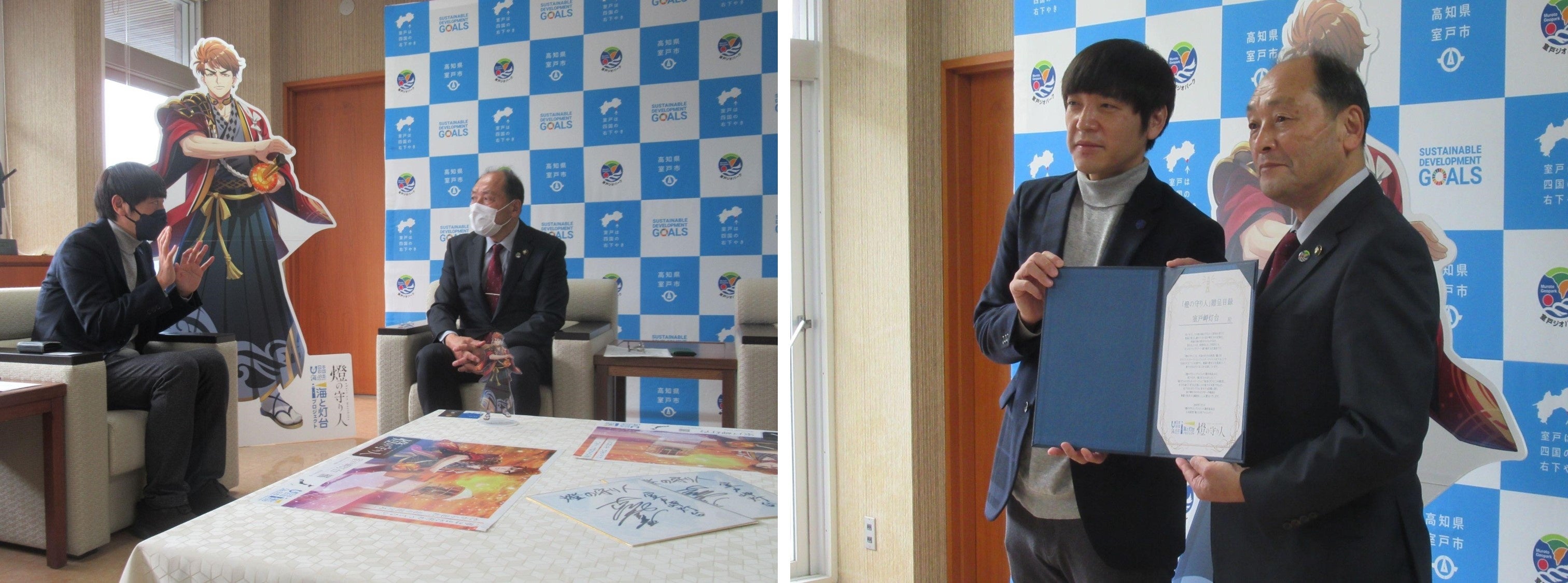 高知県室戸市「室戸岬灯台」を擬人化したキャラクターが完成! 「燈の守り人」製作委員会プロデューサーが 植田壯一郎市長を表敬訪問しキャラクター贈呈式を実施しました