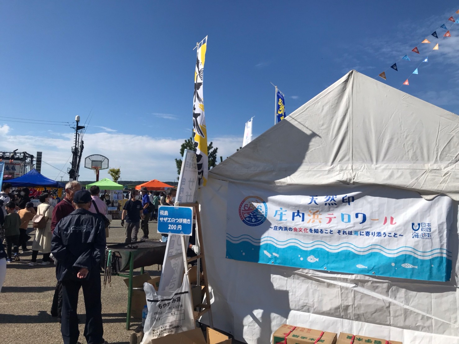 イベントでは、サザエのつぼ焼きや海鮮汁など、庄内浜の海産物に関する出店者が多く集まり、来場者に海の魅力を伝える場となりました。各出店ブースの前には、朝早くから海の幸を目当てに足を運ぶ来場者の列が。目の前で焼いたサザエを食べていた来場者は、「磯の香りが広がってとてもおいしい」と、口いっぱいに広がる海の味に満足してもらえた様子でした。イベント中は終始大勢の人が集まり賑わいを見せ、庄内浜の海の恵みを堪能することが出来たようです。