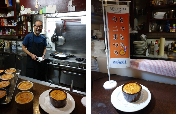試食用の「うの花ウニメニュー」は、5月からの「ムラサキウニを利用したメニュー開発検討会」にも参加いただいていた鳥取市内のフランス料理店「ムッシュたけぞう」の平尾武彦オーナーにお願いし、チーズと生クリームを加え、キッシュ生地で焼き上げたフランス料理「うの花ウニのクリーミーココット焼き」を調理いただきました。