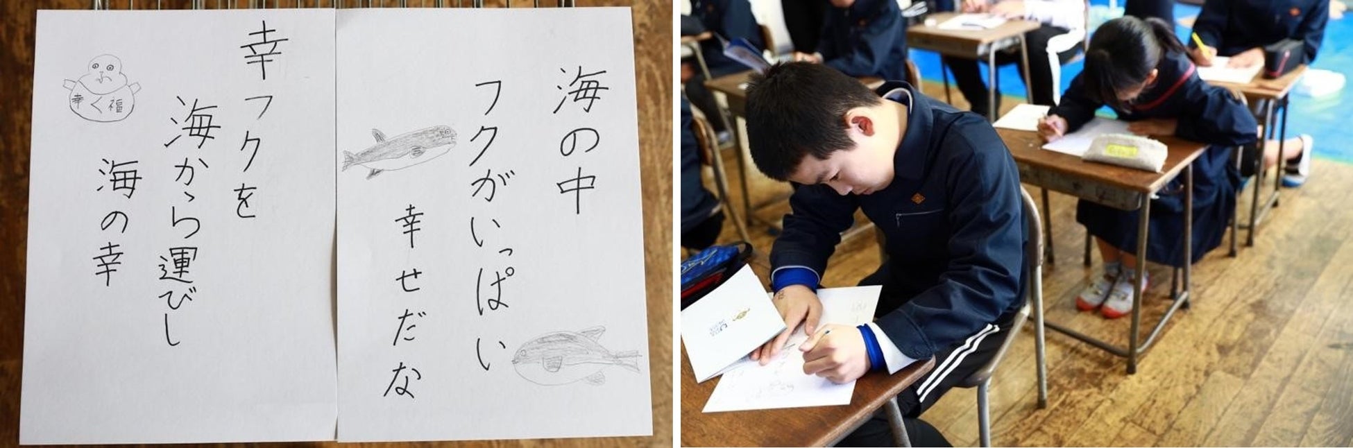 この日の海の授業のまとめとして、「ふく」を登場させた川柳を各々が書きました。普段から俳句や川柳、詩などに親しんでいる児童の皆さん、素敵な川柳をどんどん書き上げてくれました。後日、審査をして優秀賞を選定。賞品にふくを贈呈することが決まっています。
