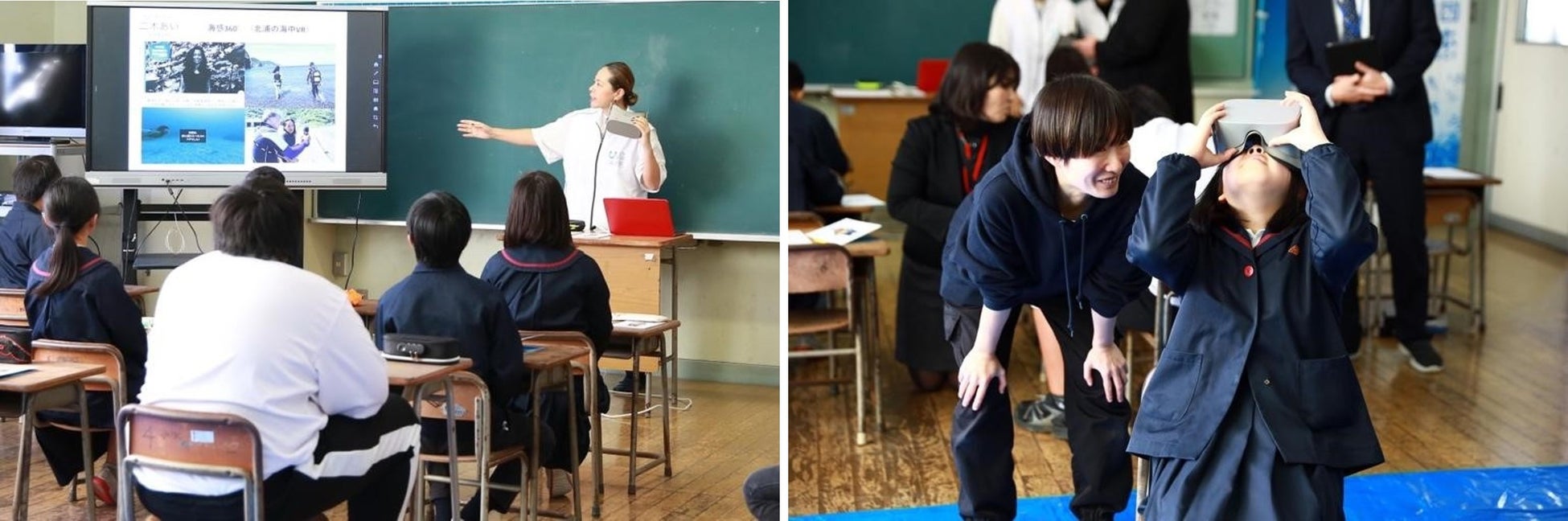 周囲をぐるりと海に囲まれた、下関市の彦島という島に本村小学校はあります。海には慣れ親しんだ子ども達ですが、海の中を見る体験は容易ではありません。下関の海水や海砂を用いて触覚や嗅覚を刺激しながら、VRゴーグルを使って下関の北浦の海の様子をバーチャル体験。海の中の映像にはもちろんふくの姿も。