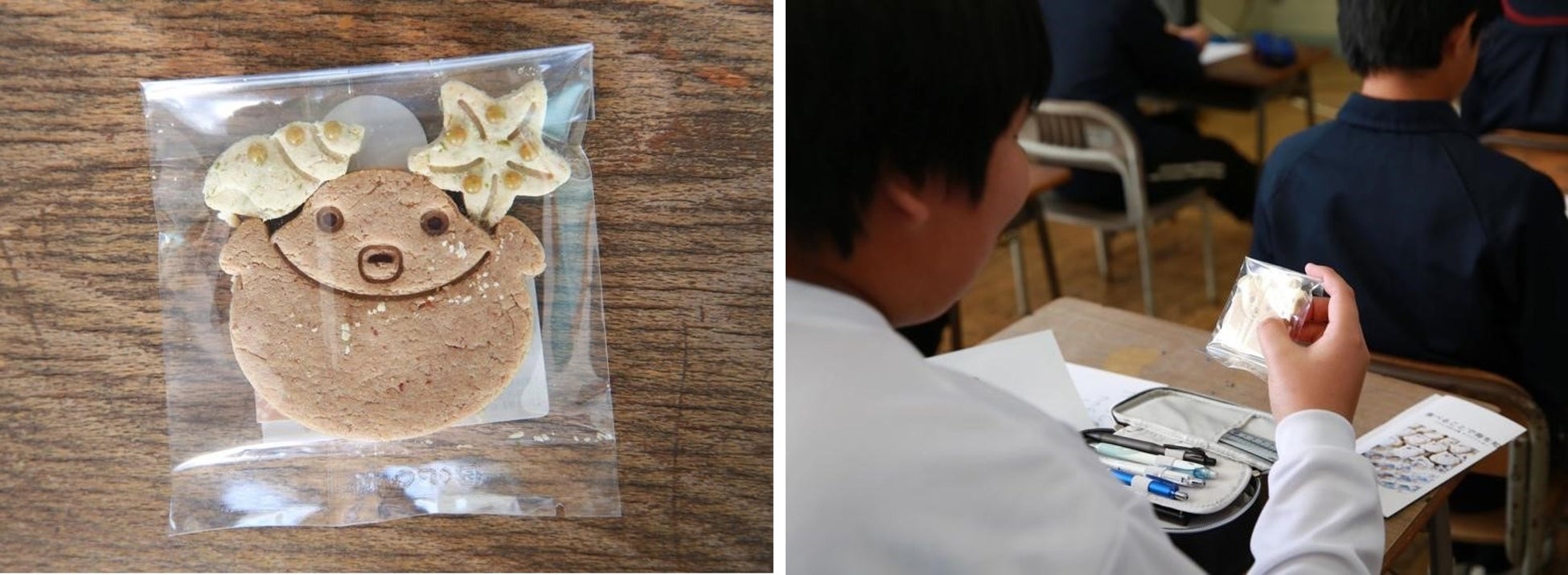 川柳を書いてくれた参加賞として、下関近海の塩、下関で採れたアオサ、マフグの粉、下関の米粉を配合したオリジナルのクッキーを、川柳を制作してくれた児童に配りました。改良に改良を重ね、甘すぎず、素材の旨みが詰まった優しいお味のクッキーは、小麦や卵アレルギーのお子さんにも食べていただけるように意識して、一枚一枚、全て手作業で大切に作られています。こちらのクッキーも来年度の活動で引き続き登場する予定です。