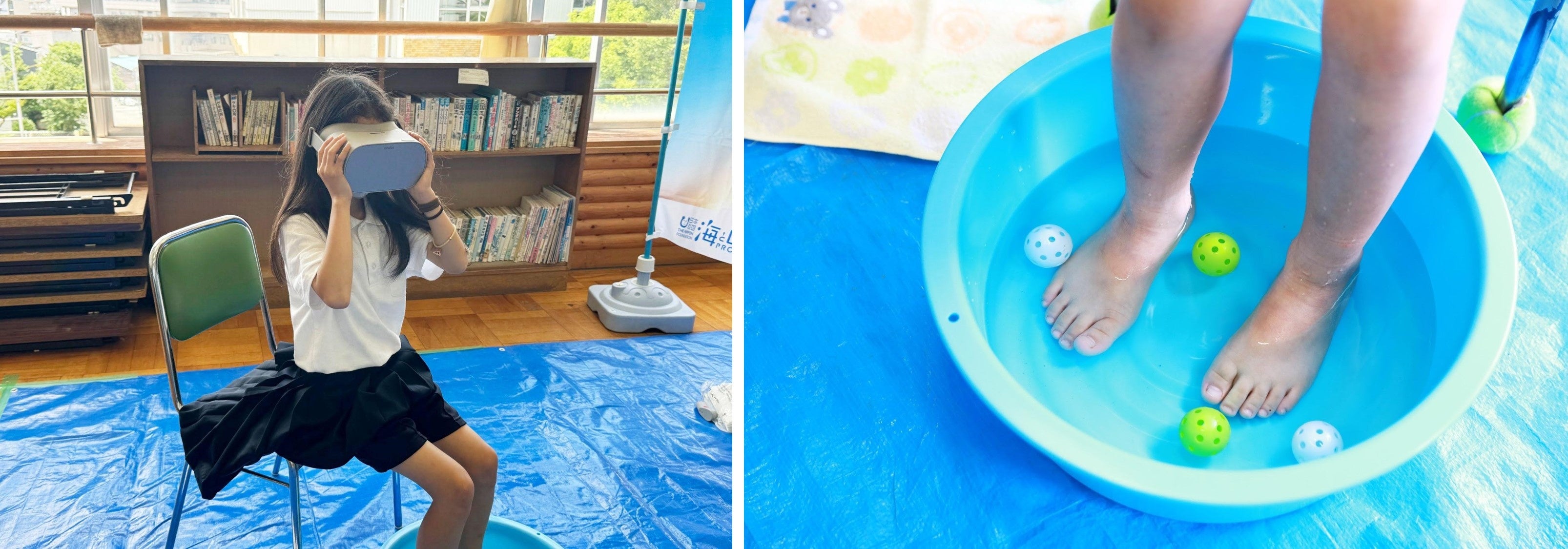 ダイバーとしてギネス記録をもち、水中生物とコミュニケーションを取りながら世界の海で水族表現家として活動する二木あいさんが魚と一緒に泳ぐシーンの映像が、前後左右360°VRでゴーグルを通して子どもたちの目の前に広がります。