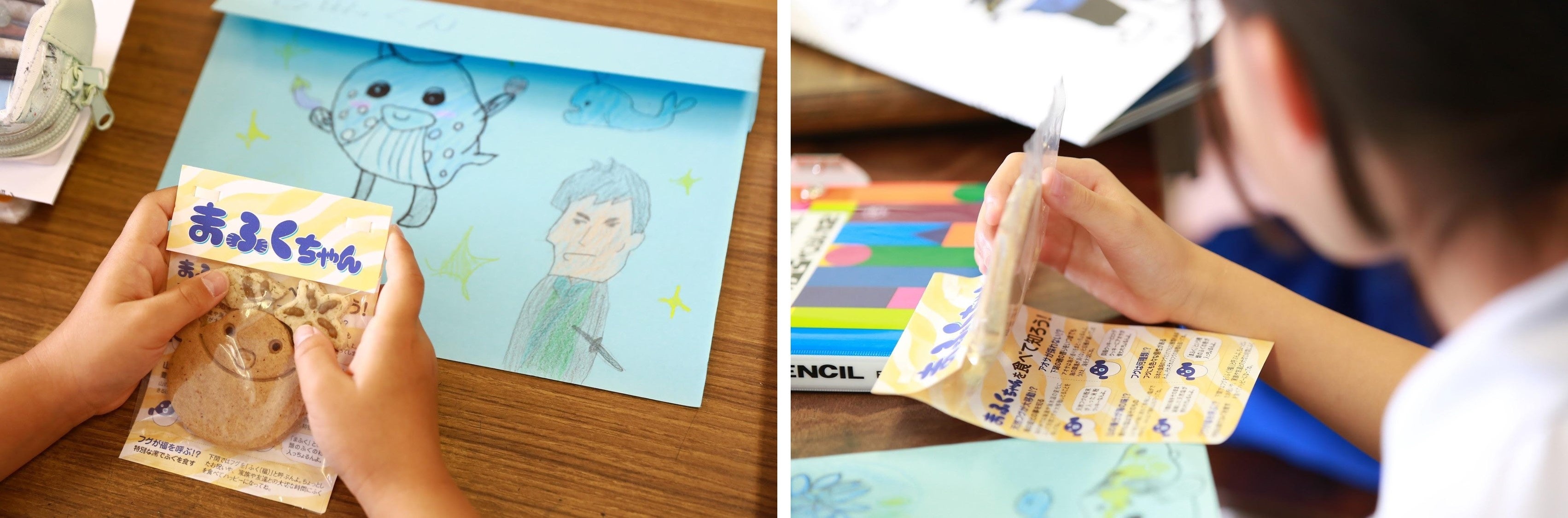 それぞれ児童のみなさんには参加賞として、下関近海の塩、下関で採れたアオサ、マフグの粉、下関の米粉を配合したオリジナルのクッキーをお配りしました。改良に改良を重ね、甘すぎず、素材と海の旨みが詰まった優しいお味のクッキーは、小麦や卵アレルギーのお子さんにも食べていただけるように意識して、一枚一枚、全て手作業で大切に作られています。またパッケージは読み物になっており、自分たちが住む下関の海の課題や、天然フクの現状、下関の海の恵みについて、クッキーを食べながら知ることができる工夫を凝らしました。こちらのクッキーは本年度の海の授業に参加してくれる子ども達にお配りする予定です。
