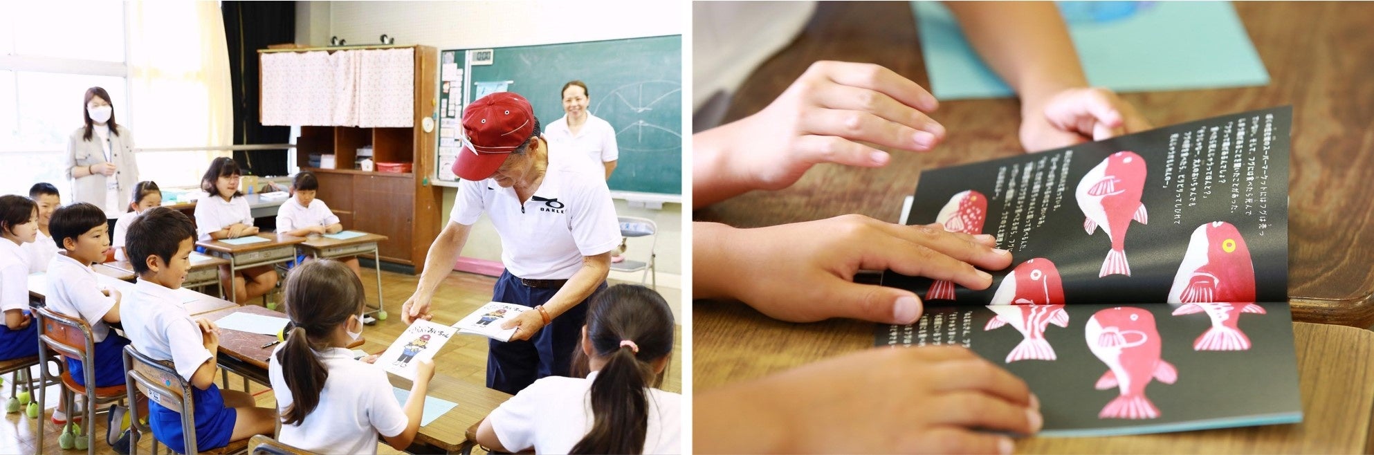 みんな、ふくおいちゃんから本をもらって嬉しそうに読んでくれたのが印象的でした。この本は本年度、約400人の子ども達を対象に行う海の授業で配布していく予定です。一冊ずつお配りしてお家に持って帰って、ご家族でふくのことを知っていただける機会や会話が生まれる、そんなハッピーな本をイメージしています。